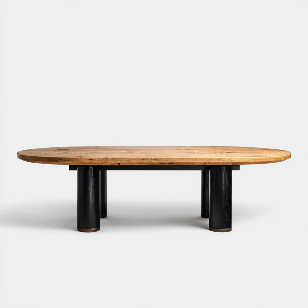 Material und VerarbeitungDer Tisch besteht aus hochwertigem Massivholz in natürlicher Farbe und robusten schwarzen Tischbeinen, die ein modernes Design betonen.