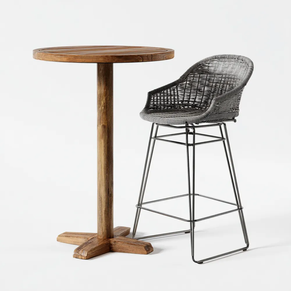 Material und VerarbeitungDer Tisch besteht aus strapazierfähigem Holz, während der Hocker aus hochwertigem Rattan in einem Grauen Farbton gefertigt ist, unterstützt von einem robusten Metallrahmen.